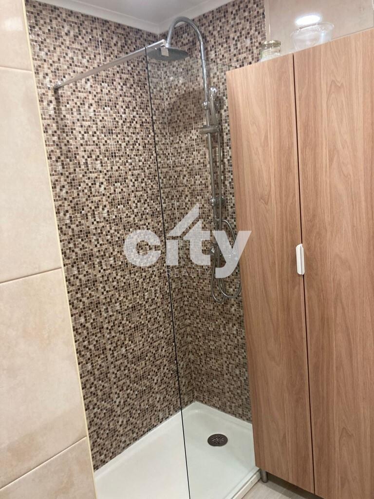 Casa de banho de remodelação recente com base de duche e proteção . Lavatório com armário incorporado e um outro armário adicional para mais arrumo.